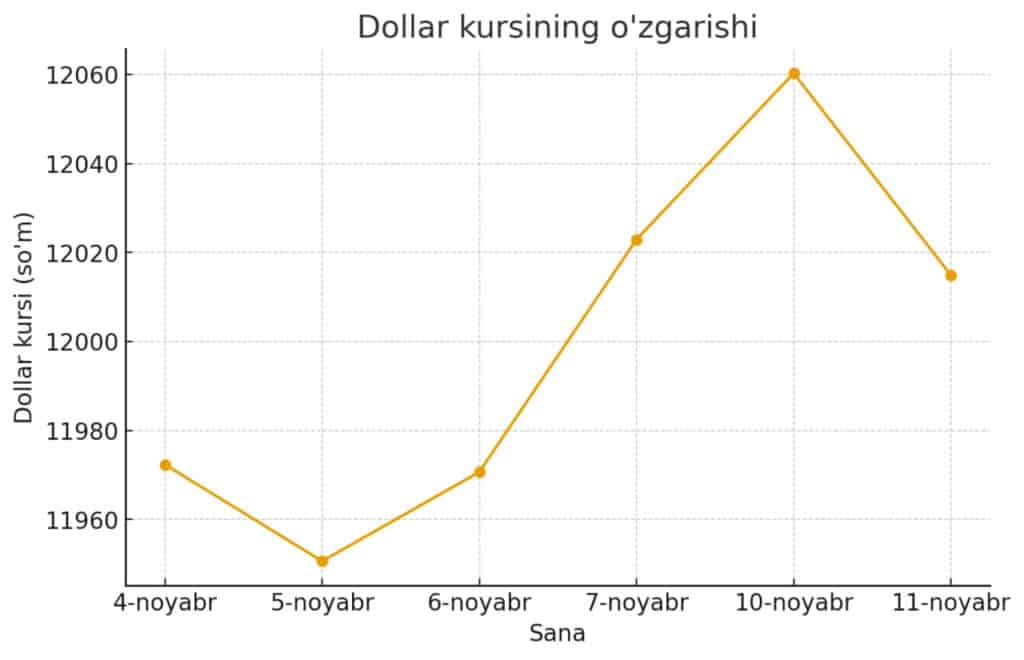 So‘nggi besh kun ichida dollar kursida pasayish ustun bo‘ldi. 4-noyabr kuni dollar 11 972,34 so‘m (-32, 75 so‘m), 5-noyabr kuni 11 950,63 so‘m (-21,71 so‘m), 6-noyabr kuni 11 970,67 so‘m (+20.04 so‘m), 7-noyabr kuni 12 022,92 so‘m (+52,25 so‘m), 10-noyabrda esa 12 060,27 so‘m (+37,35 so‘m) etib belgilangan edi.