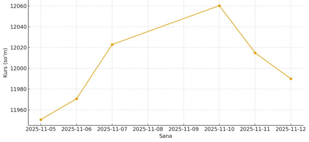So‘nggi besh kun ichida dollar kursida pasayish ustun bo‘ldi. 5-noyabr kuni 11 950,63 so‘m (-21,71 so‘m), 6-noyabr kuni 11 970,67 so‘m (+20.04 so‘m), 7-noyabr kuni 12 022,92 so‘m (+52,25 so‘m), 10-noyabrda esa 12 060,27 so‘m (+37,35 so‘m) etib belgilangan edi. 11-noyabr kuni dollar 12 014,94 so‘mga (-45,33 so‘m) tenglashdi.