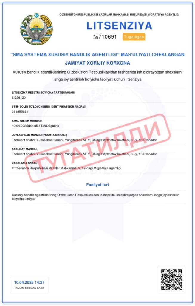 «SMA systema xususiy bandlik agentligi» MChJga joriy yilning 10-aprelida berilgan xorijda ishga joylashtirish litsenziyasi 2025-yil 5-noyabrdan bekor qilindi. Bu haqda Migratsiya agentligi xabar berdi.