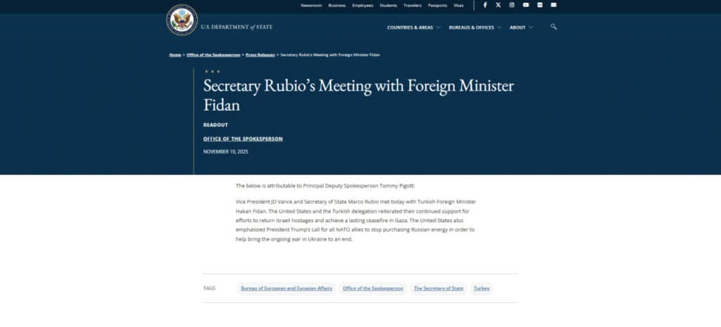AQSh Turkiyadan Rossiya neftini xarid qilmaslikka chaqirdi. Bu haqda AQSh vitse-prezidenti Jey Di Vens va davlat kotibi Marko Rubio Turkiya tashqi ishlar vaziri Hakan Fidan bilan o‘tkazilgan uchrashuvdan so‘ng ma’lum qilgan.