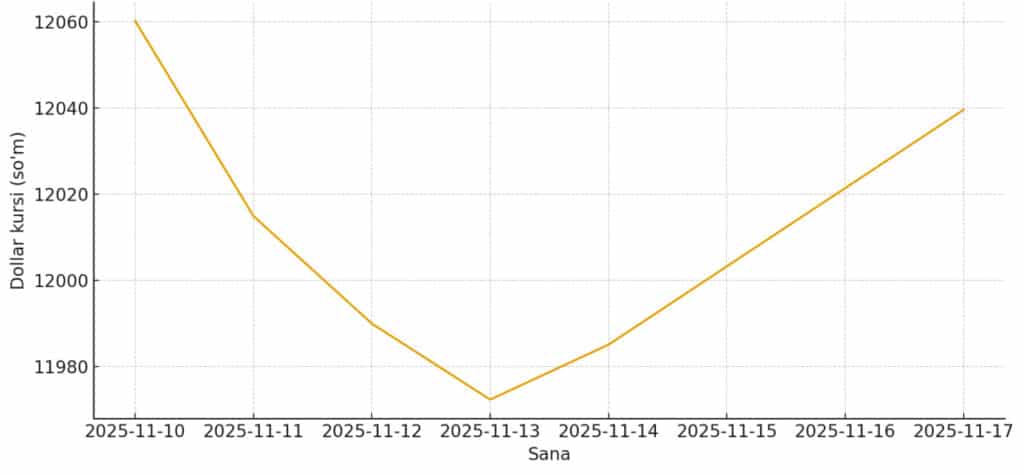 10-noyabrda 12 060,27 so‘m (+37,35 so‘m) etib belgilangan edi. 11-noyabr kuni dollar 12 014,94 so‘mga (-45,33 so‘m), 12-noyabr kuni 11 990,00 so‘mga (-24,94 so‘m), 13-noyabr kuni esa 11 972,35 so‘mga (-17,65 so‘m) tenglashdi. 14-noyabr kuni 11 985,10 so‘m (+12,75 so‘m) etib belgilandi.