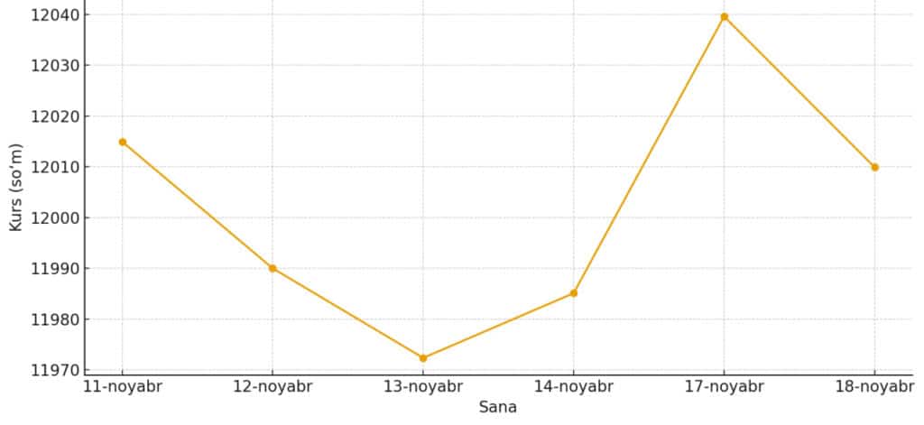 11-noyabr kuni dollar 12 014,94 so‘mga (-45,33 so‘m), 12-noyabr kuni 11 990,00 so‘mga (-24,94 so‘m), 13-noyabr kuni esa 11 972,35 so‘mga (-17,65 so‘m) tenglashdi. 14-noyabr kuni 11 985,10 so‘m (+12,75 so‘m), 17-noyabr uchun esa 12 039,61 so‘m (+54,51 so‘m) etib belgilandi.