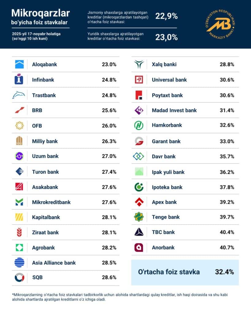 Avvalroq Kursiv Uzbekistan 10-noyabr holatiga ko‘ra, tijorat banklarida amal qilayotgan mikroqarz va avtokreditlarning so‘nggi 10 ish kuni bo‘yicha foiz stavkalari e’lon qilingani haqida yozgandi.