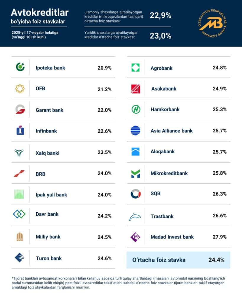 Markaziy bank izohiga ko‘ra, avtomobil ishlab chiqaruvchilar yoki dilerlar bilan hamkorlik asosida beriladigan kreditlarda foiz stavkalari pastroq bo‘lishi mumkin. Shuningdek, avtokreditlar bo‘yicha stavkalar avtomobil turi, yoshi, boshlang‘ich badal miqdori va boshqa shartlarga qarab farq qiladi.