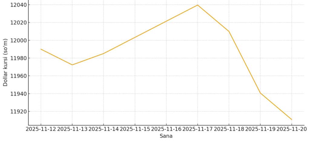 12-noyabr kuni 11 990,00 so‘mga (-24,94 so‘m), 13-noyabr kuni esa 11 972,35 so‘mga (-17,65 so‘m) tenglashdi. 14-noyabr kuni 11 985,10 so‘m (+12,75 so‘m), 17-noyabr uchun 12 039,61 so‘m (+54,51 so‘m), 18-noyabr kuni 12 009,92 so‘m (-29,69 so‘m) esa etib belgilandi. 19-noyabr kuni esa dollar 11 940,70 so‘mga tenglashgan (-69,22 so‘m) edi.
