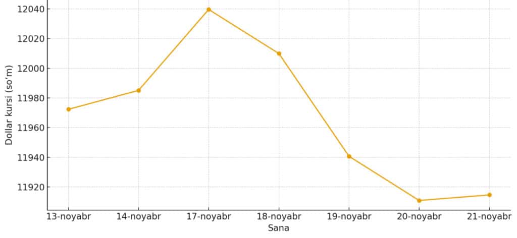 13-noyabr kuni esa 11 972,35 so‘mga (-17,65 so‘m) tenglashdi. 14-noyabr kuni 11 985,10 so‘m (+12,75 so‘m), 17-noyabr uchun 12 039,61 so‘m (+54,51 so‘m), 18-noyabr kuni 12 009,92 so‘m (-29,69 so‘m) esa etib belgilandi. 19-noyabr kuni dollar 11 940,70 so‘mga (-69,22 so‘m), 20-noyabr kuni esa 11 910,93 so‘m (-29,77 so‘m) tenglashgan edi.
