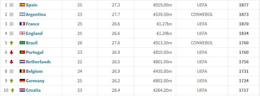 Yangilangan reytingga ko‘ra Ispaniya terma jamoasi hamon yetakchilik qilmoqda. Amaldagi jahon chempionlari ikkinchi o‘rinda bo‘lsa, Fransiya kuchli uchlikni yopib beradi. Angliya to‘rtinchi o‘rinni saqlab qolgan bo‘lsa, Braziliya termasi ikki pog‘ona ko‘tarilib 5-o‘ringa chiqib oldi. Portugaliya reytingda bir pog‘ona pastladi.