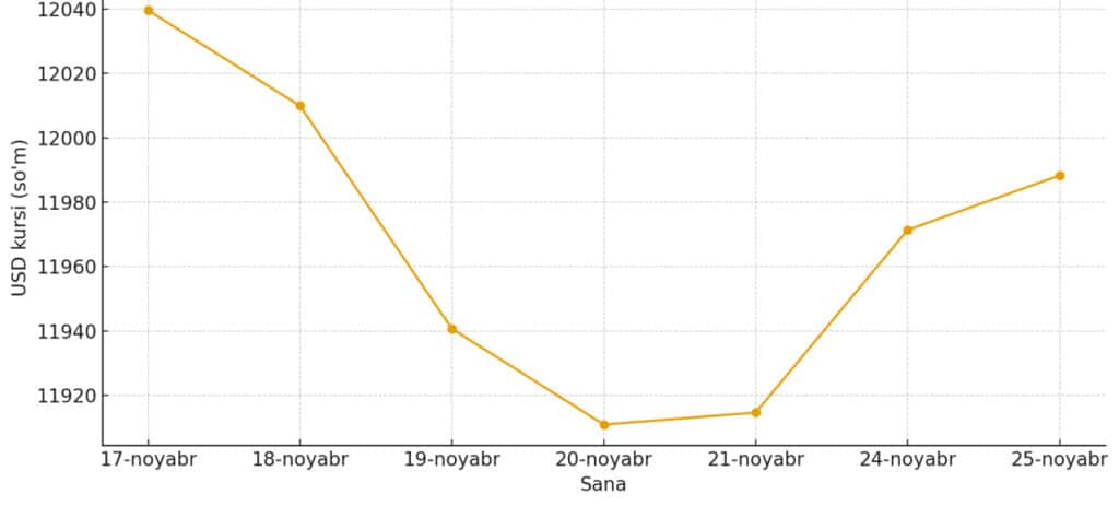 17-noyabr uchun 12 039,61 so‘m (+54,51 so‘m), 18-noyabr kuni 12 009,92 so‘m (-29,69 so‘m) etib belgilandi. 19-noyabr kuni dollar 11 940,70 so‘mga (-69,22 so‘m), 20-noyabr kuni esa 11 910,93 so‘m (-29,77 so‘m) tenglashgan edi. 21 noyabr kuni dollar 11 914,67 so‘m (+3,74 so‘m), 24-noyabr uchun esa 11 971,40 so‘m (+56,73 so‘m) etib belgilandi.