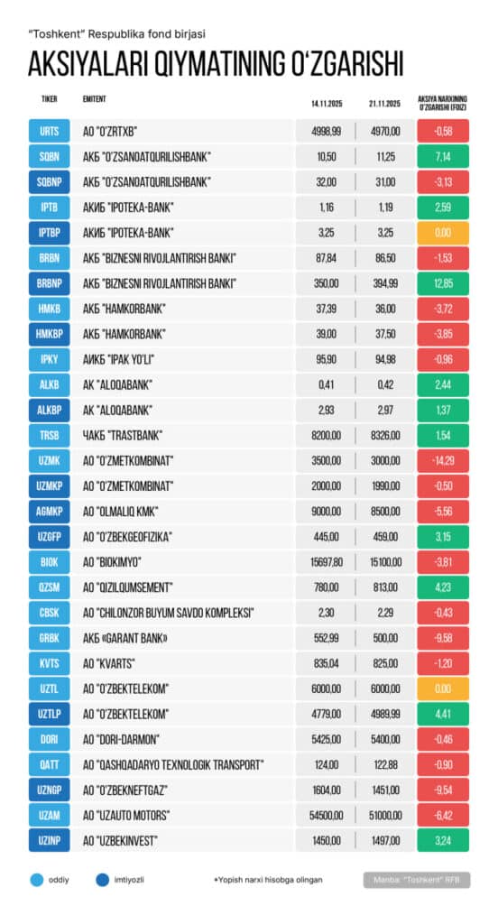 «Toshkent» respublika fond birjasi (RFB)dan joy olgan yuqori likvidli aksiyalarning aksariyati 14-noyabrdan 21-noyabrgacha bo‘lgan davrda ijobiy dinamikani ko‘rsatib, UCI fond indeksi 2,3 foizga oshdi.