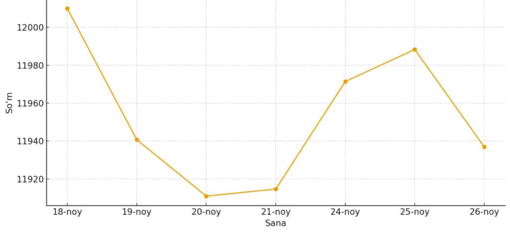 18-noyabr kuni 12 009,92 so‘m (-29,69 so‘m) etib belgilandi. 19-noyabr kuni dollar 11 940,70 so‘mga (-69,22 so‘m), 20-noyabr kuni esa 11 910,93 so‘m (-29,77 so‘m) tenglashgan edi. 21 noyabr kuni dollar 11 914,67 so‘m (+3,74 so‘m), 24-noyabr uchun 11 971,40 so‘m (+56,73 so‘m), 25-noyabr kuni esa 11 988,32 so‘m (+16,92 so‘m) etib belgilandi.
