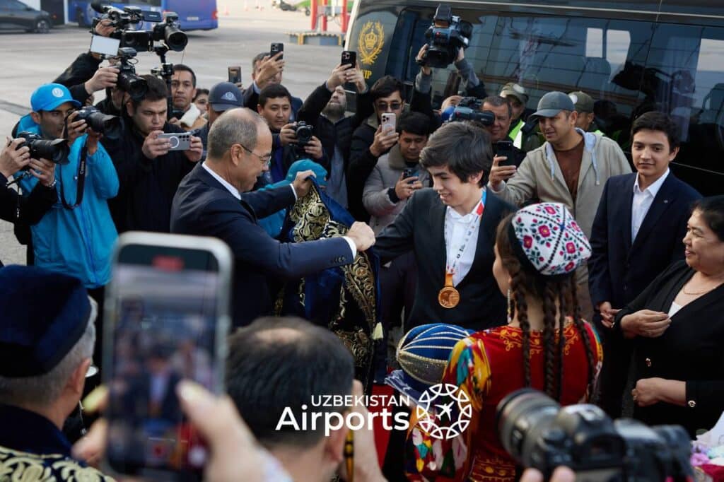 Chempionni tantanali kutib olish marosimi Toshkent aeroportining mahalliy aviaqatnovlar terminalida o‘tkazildi. Tadbirda O‘zbekiston Respublikasi bosh vaziri Abdulla Aripov, sport tashkilotlari vakillari, shaxmatchilar, chempionning oilasi va do‘stlari ishtirok etdi.