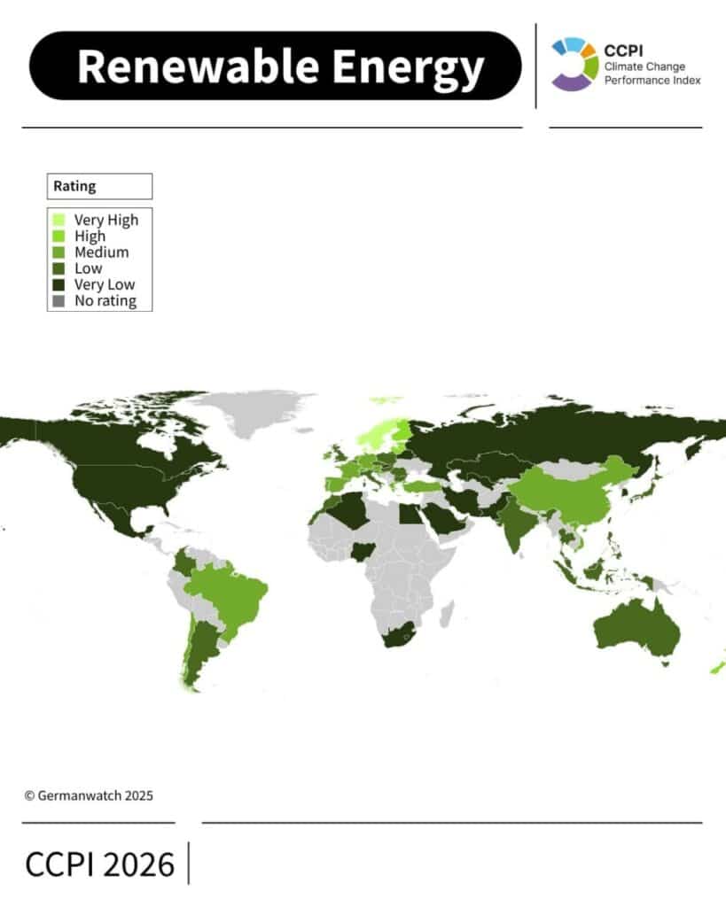 Shunga qaramay, iqlim siyosati va energiya samaradorligi bo‘yicha «o‘rtacha» ko‘rsatkich qayd etilgan. Xaritada ham O‘zbekiston qayta tiklanuvchi energiya va emissiyalar bo‘yicha past baholangan, ammo energiya iste’moli va iqlim siyosati bo‘yicha ma’lum progress bor.
