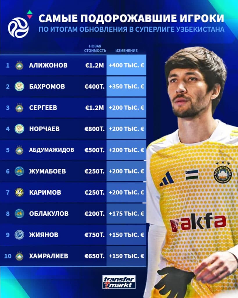 Transfermarkt portali O‘zbekiston Superligasi va Pro ligasida to‘p surayotgan futbolchilarning yangilangan transfer narxlarini e’lon qildi. Eng katta o‘sish «Paxtakor» himoyachisi Hojiakbar Alijonovda kuzatildi. Uning narxi 400 ming yevroga oshib, umumiy qiymati 1,2 mln yevroga yetdi.