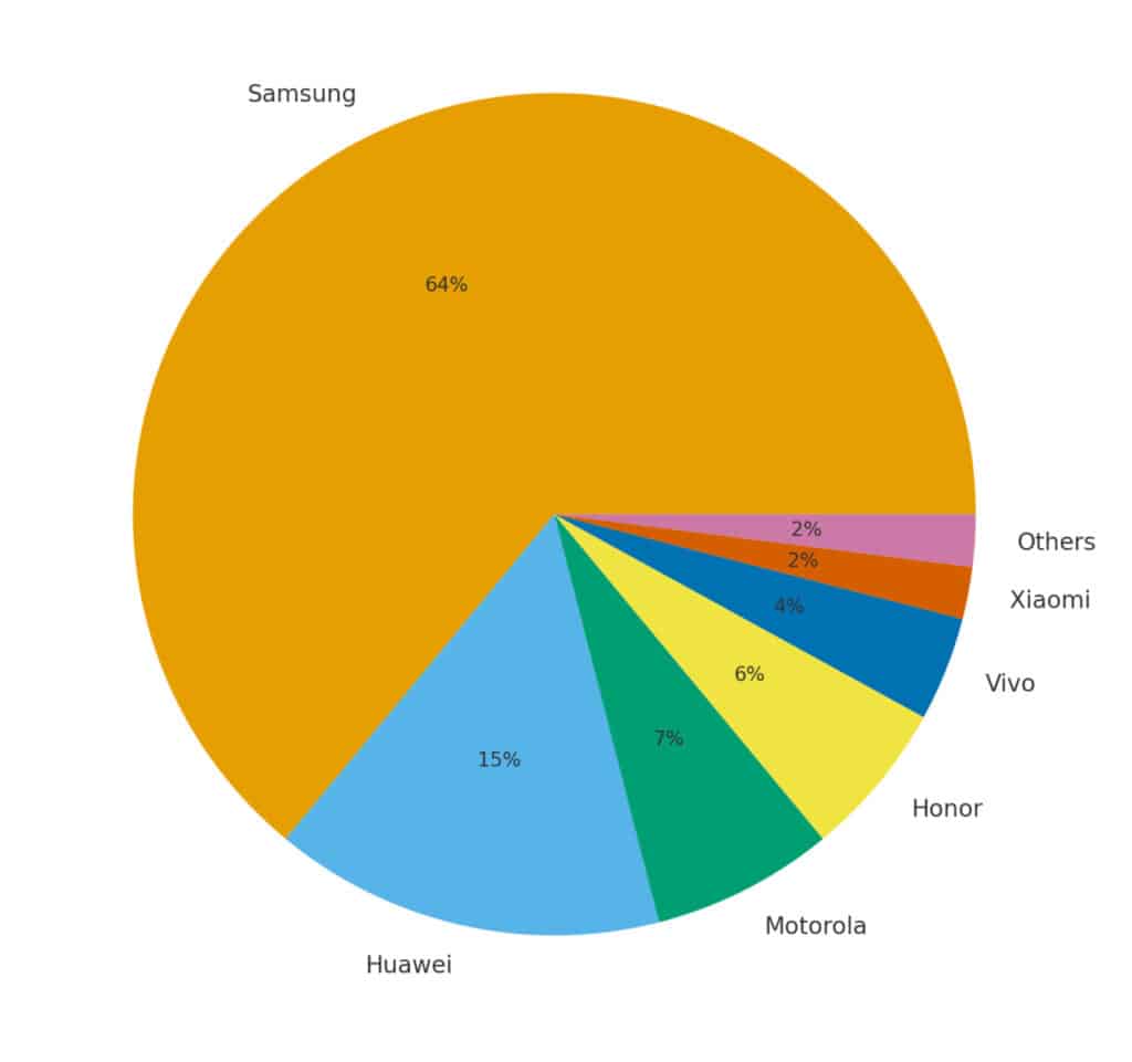 Ikkinchi va uchinchi o‘rinlarni Huawei 15 foiz va Motorola 7 foiz bozor ulushi bilan egalladi. Bu kompaniyalar o‘tgan yilgi pozitsiyalarini saqlab qoldi. Keyingi o‘rinlarda Honor 6 foiz, Vivo 4 foiz va Xiaomi 2 foiz ulush bilan qayd etildi.