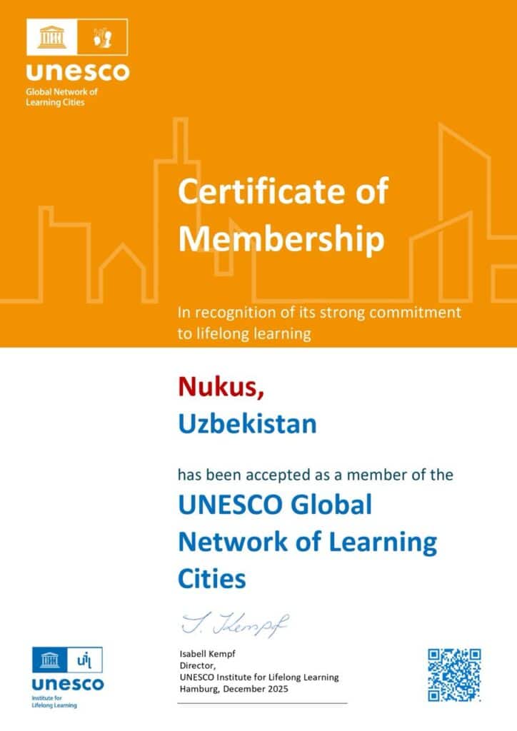 UNESCO O‘zbekistonning Nukus va Samarqand shaharlarini Ta’limni targ‘ib etuvchi shaharlar global tarmog‘i (GNLC) tarkibiga qabul qildi. Bu haqda Oliy ta’lim, fan va innovatsiyalar vazirligi xabar berdi.