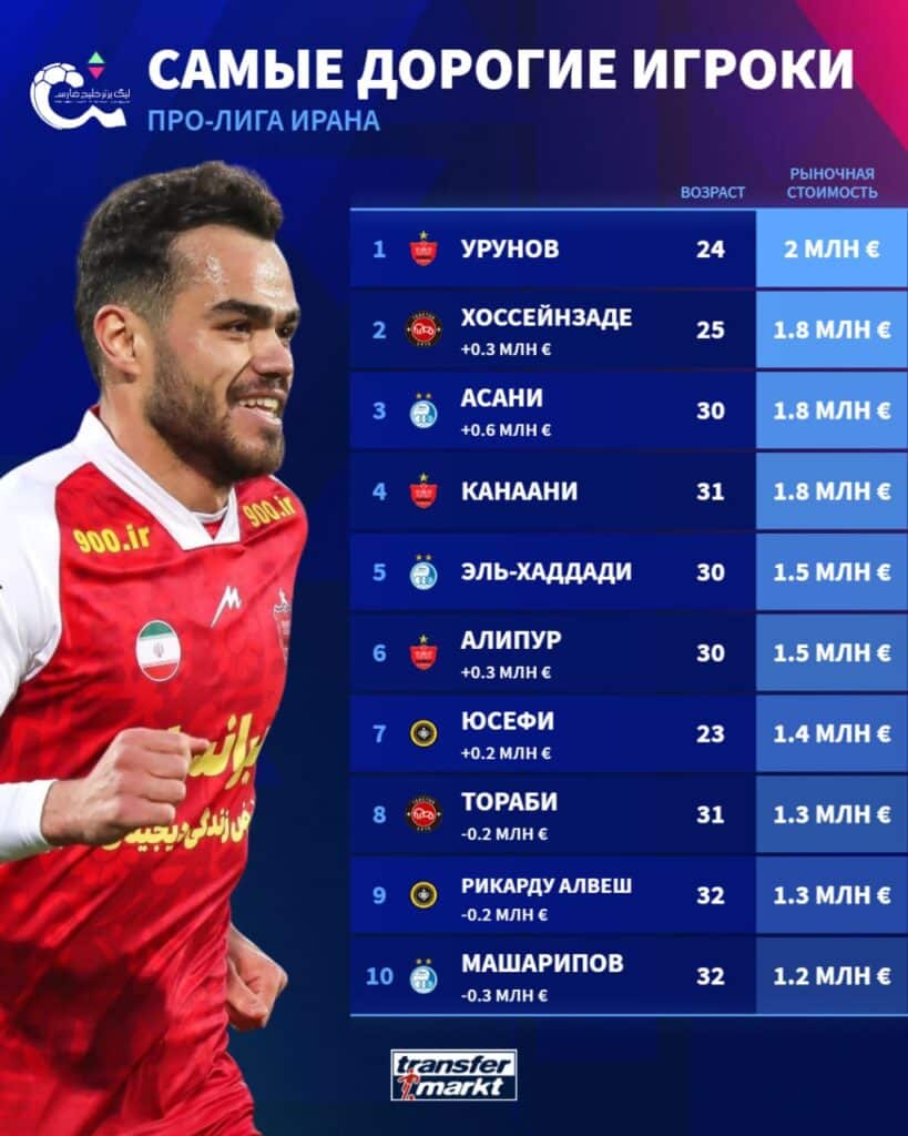 O‘zbekiston milliy terma jamoasi va «Persepolis» klubi yarim himoyachisi Oston O‘runov 2 mln yevro bilan chempionatning eng qimmat futbolchisi deb topildi. Reytingning kuchli o‘nligiga yana bir o‘zbekistonlik legioner Jaloliddin Masharipov ham kirdi.