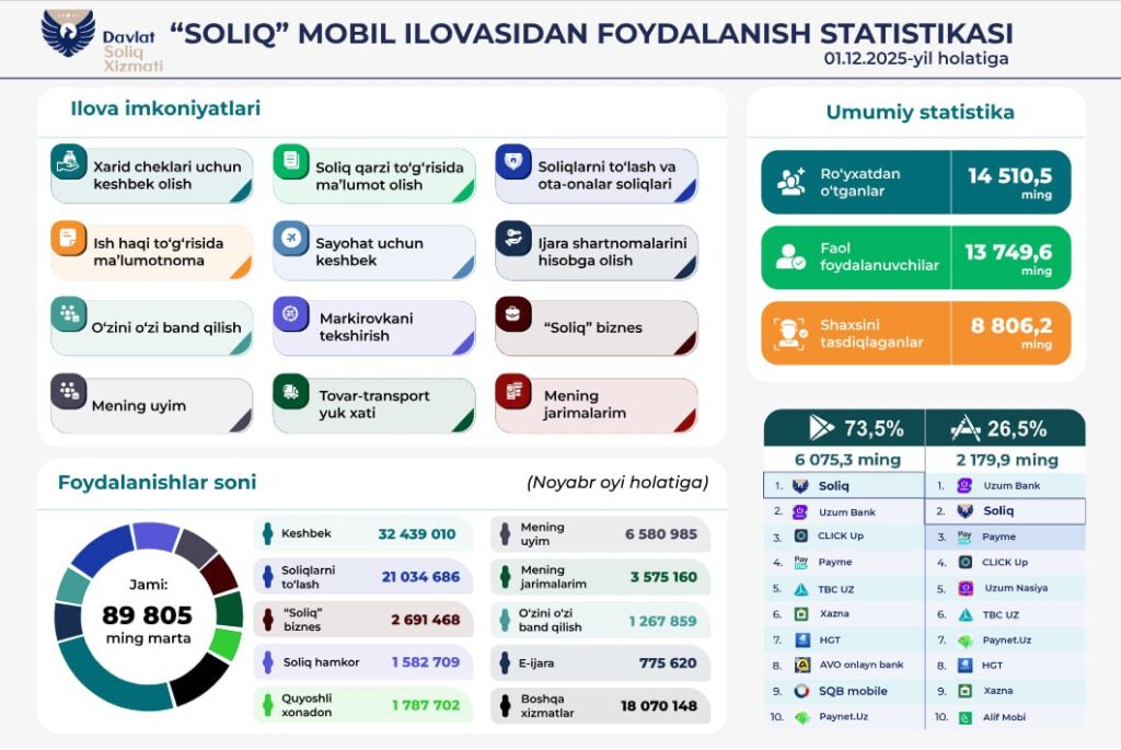 Davlat soliq xizmati 2025-yil 1-dekabr holatiga ko‘ra, Soliq mobil ilovasidan foydalanish bo‘yicha yangilangan statistikani e’lon qildi.