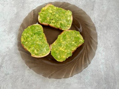 Non ustiga tvorogli pishloq surtib, avokado bo‘laklarini tering. Tuz, paprika va limon sharbati sepib chiqasiz.