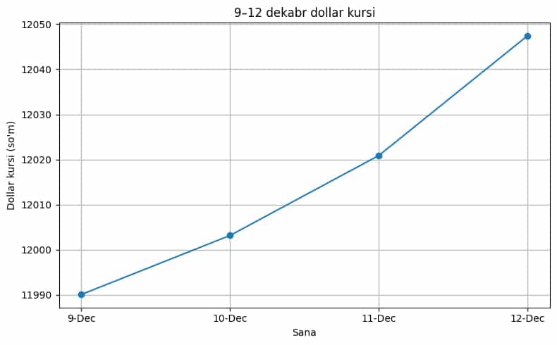 Kursdagi o‘sish tendensiyasi 11-dekabr kuni ham davom etdi — AQSh valyutasi 12 020,90 so‘m bo‘lib, kunlik o‘zgarish +17,72 so‘mni tashkil qildi. 12-dekabrda esa dollar 12 047,45 so‘mga chiqib, yana 26,55 so‘mga ko‘tarildi.