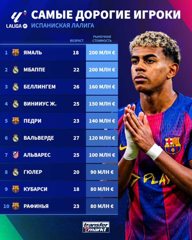 Transfermarkt maʼlumotlariga koʻra, La Liga doirasida Mbappe va Yamal birinchi oʻrinni boʻlishib turibdi. Uchinchi oʻrinda «Real Madrid» yarim himoyachisi Jud Bellingem joylashib, uning bozor qiymati 160 million yevroga teng. Keyingi oʻrinlarda Vinisius Junior (150 million yevro) va Pedri (140 million yevro) qayd etilgan.