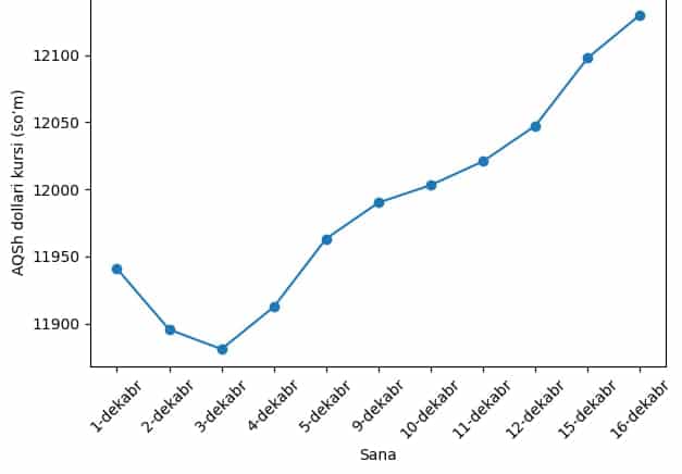 4-dekabrda bozor yo‘nalishini o‘zgartirdi. AQSh valyutasi yana mustahkamlanib, 11 912,38 so‘mga chiqdi. Kunlik o‘sish 31,45 so‘m bo‘ldi. 5-dekabr kuni esa haftadagi eng katta ko‘tarilish qayd etildi. Dollar 50,85 so‘mga oshib, 11 963,23 so‘m darajasiga yetdi. 9-dekabr kuni dollar 11 990,09 so‘m (+26,86 so‘m), 10-dekabrda esa 12 003,18 so‘m (+13,09 so‘m) edi. 11-dekabr uchun AQSh valyutasi 12 020,90 so‘m (+17,72 so‘m), 12-dekabr uchun 12 047,45 so‘m (+26,55 so‘m), 15-dekabr uchun esa 12 097,93 so‘m (+50,48 so‘m) etib belgilandi.