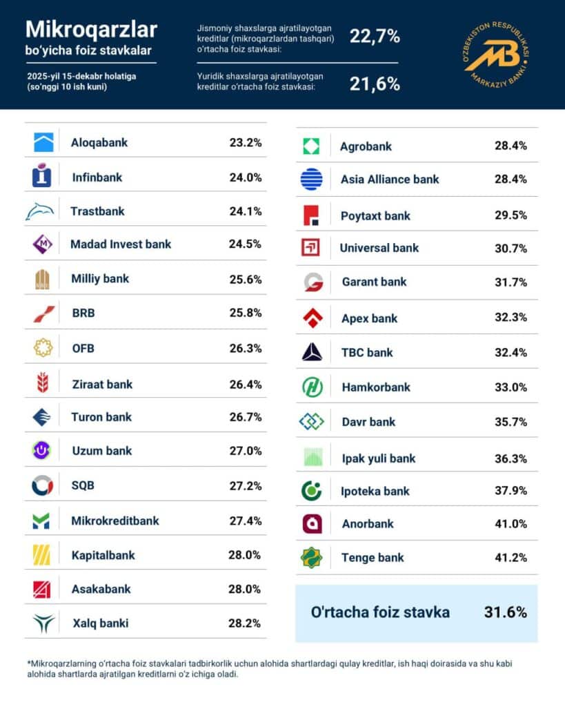 Mazkur davrda mamlakatdagi tijorat banklari tomonidan taqdim etilayotgan mikroqarzlar bo‘yicha o‘rtacha foiz stavkasi 31,6 foizni tashkil etdi. Shundan jismoniy shaxslarga ajratilayotgan kreditlarning (mikroqarzlardan tashqari) o‘rtacha foiz stavkasi 22,7 foizni, yuridik shaxslar ulushi esa 21,6 foizni ko‘rsatmoqda.