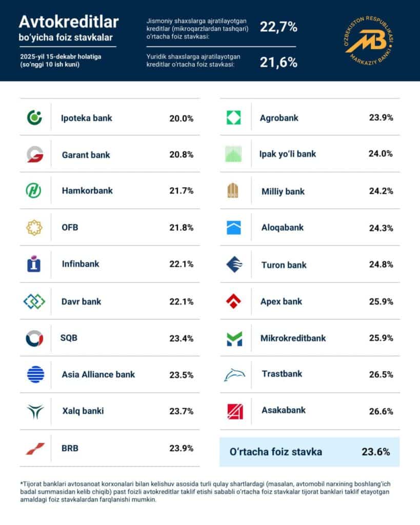 Avtomobil xaridi uchun ajratilayotgan kreditlar bo‘yicha o‘rtacha foiz stavkasi ham 23,6 foizni tashkil etdi. Shundan jismoniy shaxslarga ajratilayotgan kreditlarning (mikroqarzlardan tashqari) o‘rtacha foiz stavkasi 22,7 foizni, yuridik shaxslar ulushi esa 21,6 foizni ko‘rsatmoqda.