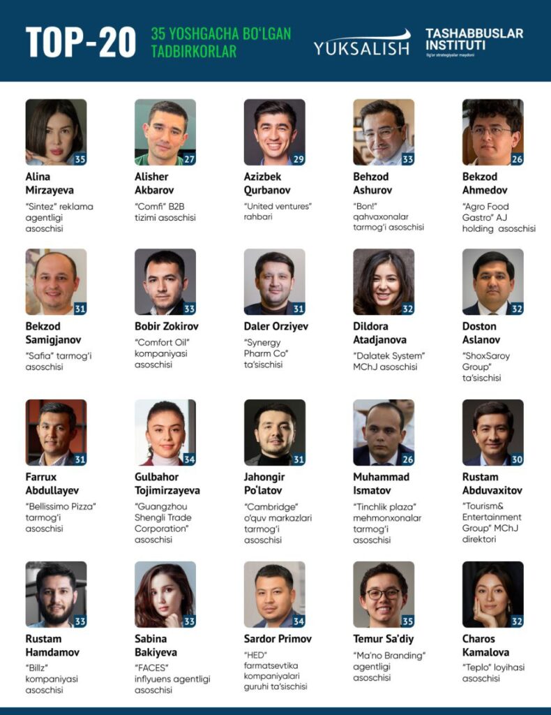 «Yuksalish» umummilliy harakati Ijtimoiy va iqtisodiy tashabbuslar instituti bilan hamkorlikda O‘zbekistonda faoliyat yuritayotgan 35 yoshgacha bo‘lgan yosh tadbirkorlar reytingini taqdim etdi.
