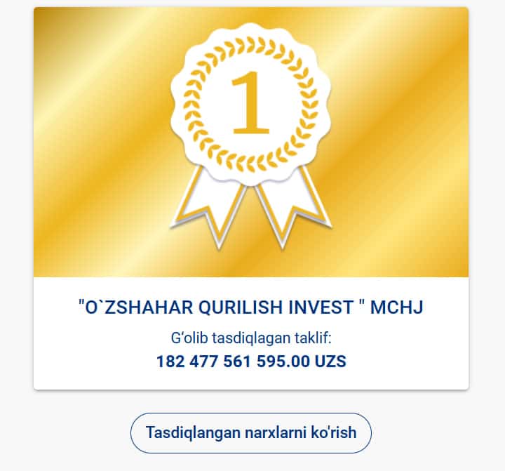 Savdolar yakuniga ko‘ra, obyekt 182,477 mlrd so‘mga sotildi. Bu ko‘rsatkich boshlang‘ich narxdan qariyb 40 foizga yuqori. Eng yuqori taklif bilan «O‘zshahar Qurilish Invest» kompaniyasi auksion g‘olibi bo‘ldi.