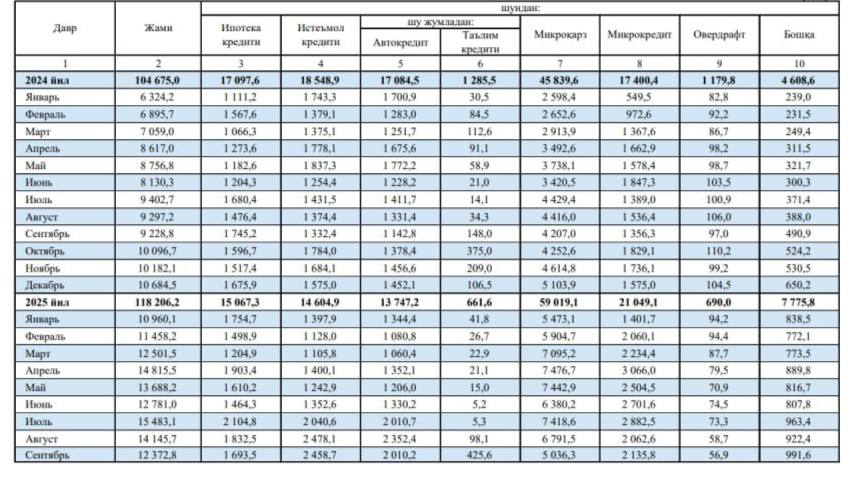 O‘tgan yilning mart oyidan tashqari sentabr oyigacha ta‘lim krediti uchun olingan mablag‘larda yuqorilash kuzatilmagandi. Ammo oliy ta’lim muassasalarida yangi o‘quv boshlanishi bilanoq, sentabrda ta‘lim kreditini oluvchilar soni oshdi, ular tomonidan 148 mlrd so‘m kredit olingan. Joriy yilning dastlabki 8 oyi davomida banklar tomonidan berilgan ta’lim kreditining miqdori biror marta ham 100 mlrd so‘mdan oshmadi. Ammo sentabrga kelib, bu ko‘rsatkich 425,6 mlrd so‘mni tashkil qildi.