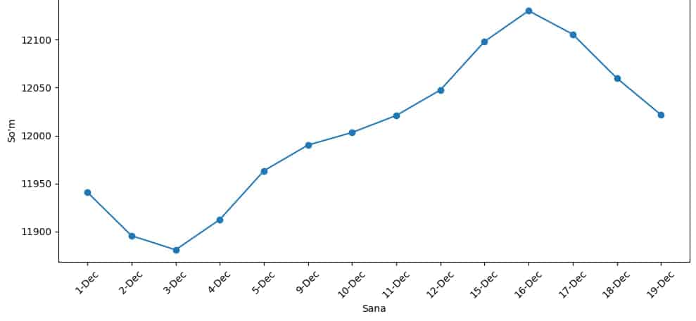 4-dekabrda bozor yo‘nalishini o‘zgartirdi. AQSh valyutasi yana mustahkamlanib, 11 912,38 so‘mga chiqdi. Kunlik o‘sish 31,45 so‘m bo‘ldi. 5-dekabr kuni esa haftadagi eng katta ko‘tarilish qayd etildi. Dollar 50,85 so‘mga oshib, 11 963,23 so‘m darajasiga yetdi. 9-dekabr kuni dollar 11 990,09 so‘m (+26,86 so‘m), 10-dekabrda esa 12 003,18 so‘m (+13,09 so‘m) edi. 11-dekabr uchun AQSh valyutasi 12 020,90 so‘m (+17,72 so‘m), 12-dekabr uchun 12 047,45 so‘m (+26,55 so‘m), 15-dekabr uchun esa 12 097,93 so‘m (+50,48 so‘m) etib belgilandi. 16-dekabrda 12 130,01 so‘m (+32,08 so‘m), 17-dekabrda 12 105,56 so‘mga (-24,45so‘m), 18-dekabr kuni esa 12 059,78 so‘mga (-45,78 so‘m) tenglashdi.