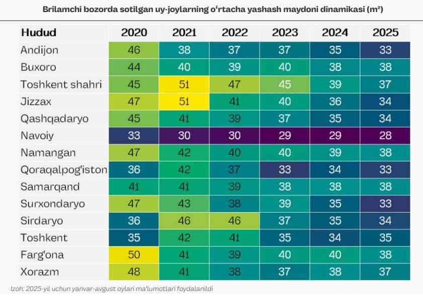 Tahlillarga ko‘ra, 2020-yilning yanvar oyidan 2025-yilning avgust oyigacha bo‘lgan davrda sotilgan yangi qurilgan kvartiralarning o‘rtacha yashash maydoni barcha hududlarda pasayib, o‘rtacha 45 – 47 kvadrat metrdan 33 – 38 kvadrat metrgacha kamaygan. Ayniqsa, urbanizatsiya jarayoni jadal kechayotgan va aholi zichligi yuqori bo‘lgan hududlarda qisqarish yaqqol ko‘zga tashlanadi.