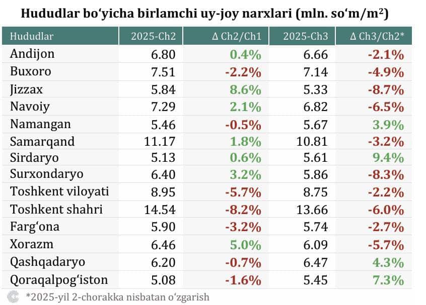 Uy-joy nominal narxlari 2020 – 2023-yillarda keskin oshib, 2024-yilning ikkinchi choragida eng yuqori darajaga yetdi. 2025-yilning uchinchi choragiga kelib narxlar o‘z cho‘qqisiga nisbatan birlamchi bozorda 4,5 foizga, ikkilamchi bozorda esa 8,3 foizga pasaydi.