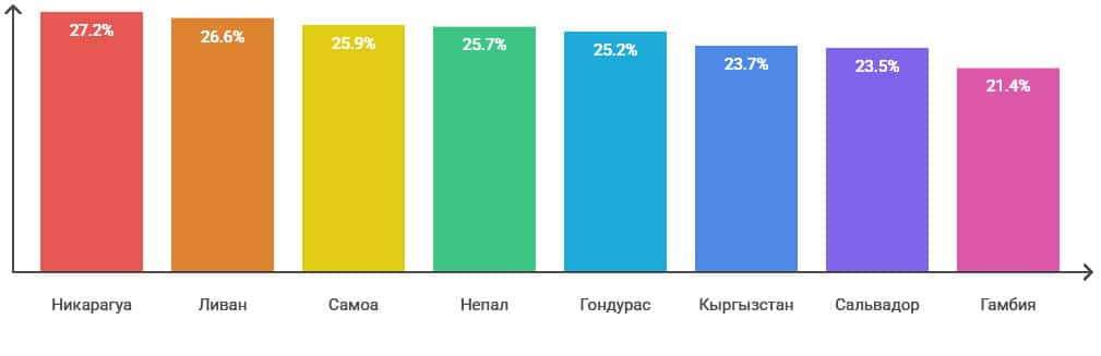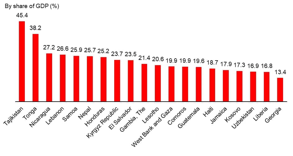 Xususan, Tojikiston, Qirg‘iziston va O‘zbekiston ana shunday davlatlar qatoriga kiradi. Bank taqdim qilgan statistika ko‘ra, 2024-yilda migrantlarning pul o‘tkazmalari Tojikiston yalpi ichki mahsulotining(YIM) 45,4 foizini tashkil etgan, bu nisbiy jihatdan dunyoda eng yuqori ko‘rsatkichdir. O‘tgan yilda respublikaga pul o‘tkazmalari hajmi 5,8 mlrd dollarni tashkil etdi. Tinch okeanidagi orol davlat bo‘lmish Tonganiki Tojikistondan keyin sezilarli farq bilan yalpi ichki mahsulotning 38,2 foizini tashkil qiladi. Undan keyin quyidagi davlatlar o‘rin olgan: