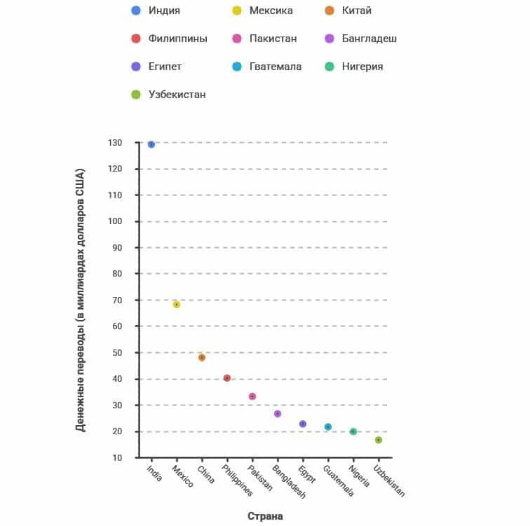 2024-yil holatiga ko‘ra, fuqarolaridan pul o‘tkazmalari hajmi bo‘yicha eng yaxshi o‘nta mamlakatlar qatoriga Hindiston (129,1 mlrd dollar), Meksika (68,2 mlrd dollar), Xitoy (48 mlrd dollar), Filippin (40,2 mlrd dollar), Pokiston (33,2 mlrd dollar) Bangladesh (26,6 mlrd dollar), Misr (22,7 mlrd dollar), Gvatemala (21,6 mlrd dollar), Nigeriya (19,8 mlrd dollar) va O‘zbekiston (16,6 mlrd dollar) kiradi.