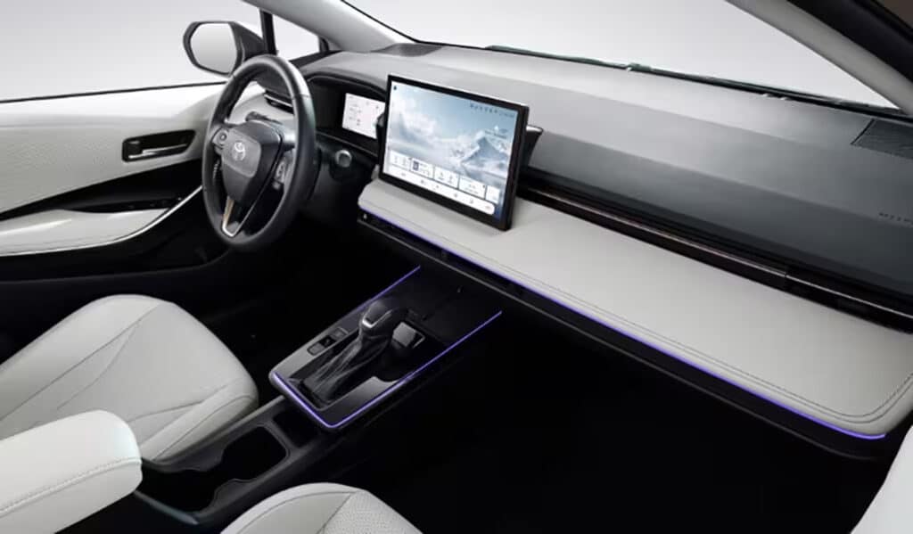 Salon minimalistik qora-oq ranglarda ishlangan. Jihozlarga 8,8 dyuymli raqamli asboblar paneli va Apple CarPlay hamda Huawei HiCar qo‘llab-quvvatlovchi 12,9 dyuymli media-ekran kiradi. Variantlar orasida 50 Vt quvvatli simsiz zaryadlash, 64 rangli atmosferik yoritish va yashirin shamollatish deflektorlar mavjud. Xavfsizlikni Toyota Pilot yordamchi tizimi ta’minlaydi, bu tizim avtomobilning standart jihozlariga kiritilgan.