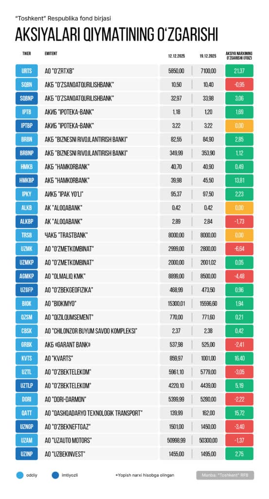 «Toshkent» respublika fond birjasi (RFB)dan joy olgan yuqori likvidli aksiyalarning aksariyati 12-dekabrdan 19-dekabrgacha bo‘lgan davrda ijobiy dinamikani ko‘rsatdi. Lekin UCI fond indeksi 1,04 foizga tushdi.