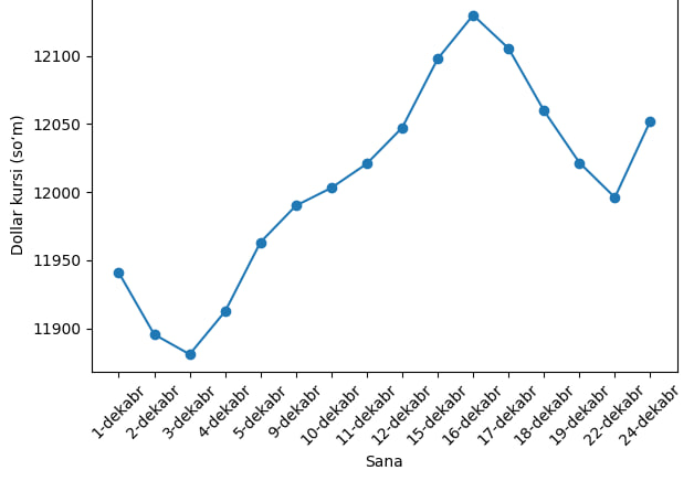 1-dekabr kuni valyuta kursi 11 940,95 so‘m etib belgilandi va oldingi kunga nisbatan 38,65 so‘mga oshdi. 2-dekabrda vaziyat o‘zgardi. Dollar 11 895,57 so‘mga tushib, kunlik hisobda 45,38 so‘m pasaydi. 3-dekabr kuni kurs pasayishda davom etdi va 11 880,93 so‘mni tashkil qildi. Bu kunda dollar yana 14,64 so‘mga arzonlashdi.