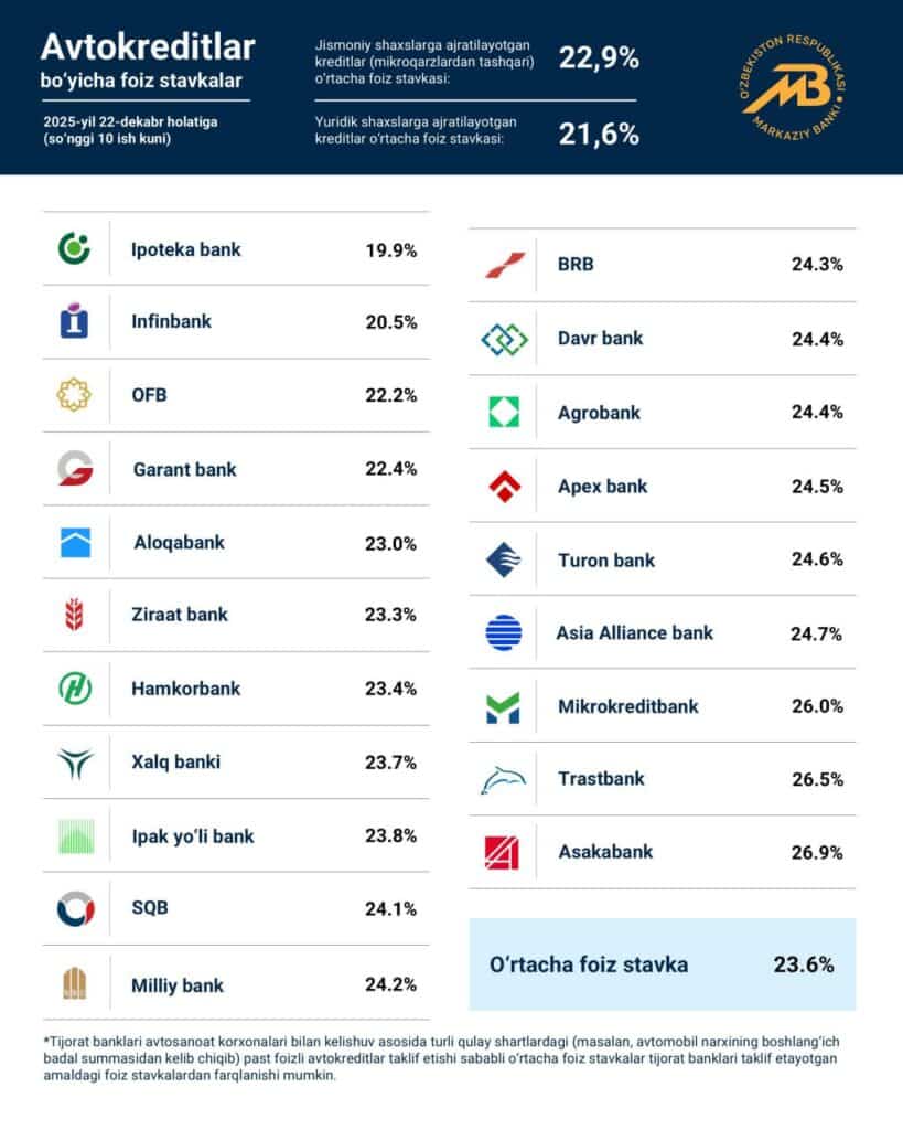 Avtomobil xaridi uchun ajratilayotgan kreditlar bo‘yicha o‘rtacha foiz stavkasi ham 23,6 foizni tashkil etdi. Shundan jismoniy shaxslarga ajratilayotgan kreditlarning (mikroqarzlardan tashqari) o‘rtacha foiz stavkasi 22,9 foizni, yuridik shaxslar ulushi esa 21,6 foizni ko‘rsatmoqda.