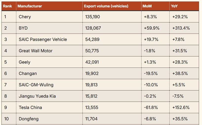 Noyabr oyida Chery kompaniyasi 135 mingta avtomobil bilan Xitoyda eng yirik eksportchi bo‘lib qolgan bo‘lsa-da, BYD ikkinchi o‘ringa chiqib, yetakchiga tez yaqinlashmoqda.