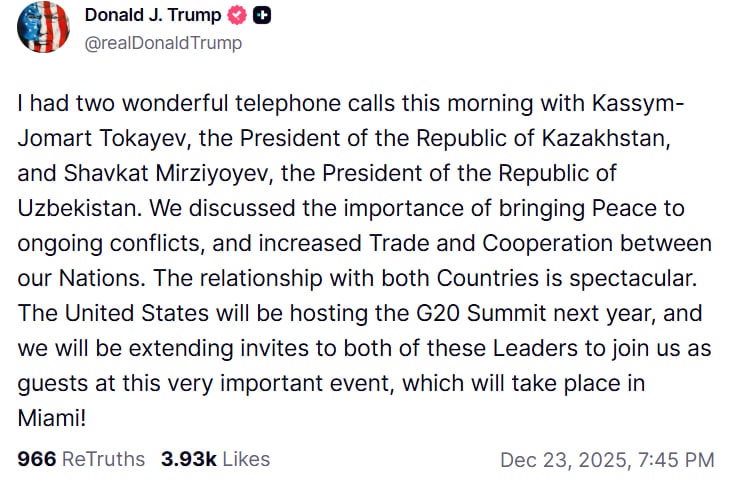 «Bugun ertalab men Qozog‘iston Respublikasi prezidenti Qosim-Jo‘mart Toqayev va O‘zbekiston Respublikasi prezidenti Shavkat Mirziyoyev bilan ajoyib telefon suhbatlarini o‘tkazdim. Biz davom etayotgan mojarolarda tinchlikni ta’minlash, shuningdek, mamlakatlarimiz o‘rtasidagi savdo va hamkorlikni oshirishning ahamiyati haqida fikr almashdik. Har ikki mamlakat bilan munosabatlar ajoyib darajada. Kelasi yili AQSh G20 sammitiga mezbonlik qiladi va biz ushbu muhim tadbirda ishtirok etish uchun ikki davlat rahbarini ham mehmon sifatida taklif qilamiz. Sammit Mayami shahrida o‘tkaziladi!»