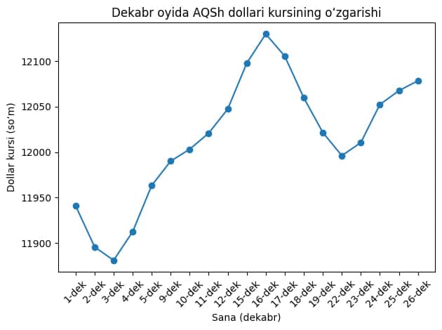 1-dekabr kuni valyuta kursi 11 940,95 so‘m etib belgilandi va oldingi kunga nisbatan 38,65 so‘mga oshdi. 2-dekabrda vaziyat o‘zgardi. Dollar 11 895,57 so‘mga tushib, kunlik hisobda 45,38 so‘m pasaydi. 3-dekabr kuni kurs pasayishda davom etdi va 11 880,93 so‘mni tashkil qildi. Bu kunda dollar yana 14,64 so‘mga arzonlashdi.