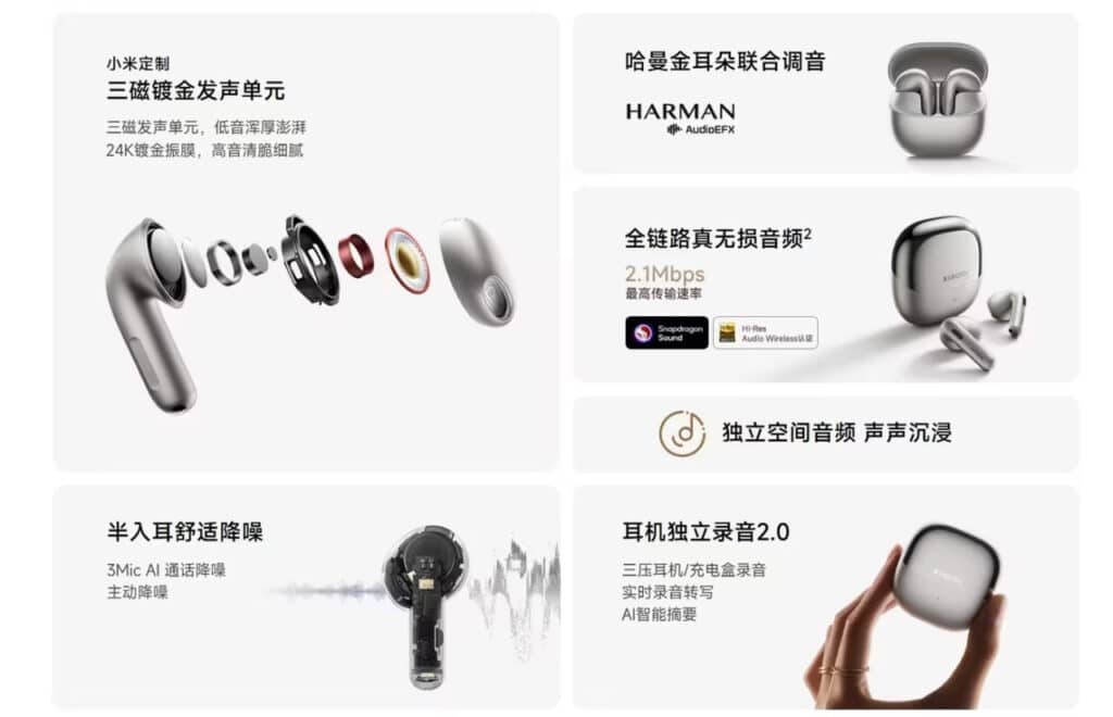 Yangi quloqchinlar uch magnitli maxsus drayverlar bilan jihozlangan. Dinamiklar 24 karatli oltin qoplamaga ega bo‘lib, Xiaomi ma’lumotiga ko‘ra, bu past chastotalarga sezgirlikni 40 foizga, yuqori chastotalarni esa 30 foizga oshiradi. E’lon qilingan tovush diapazoni 16 Gtsdan 40 kGtsgacha yetadi.