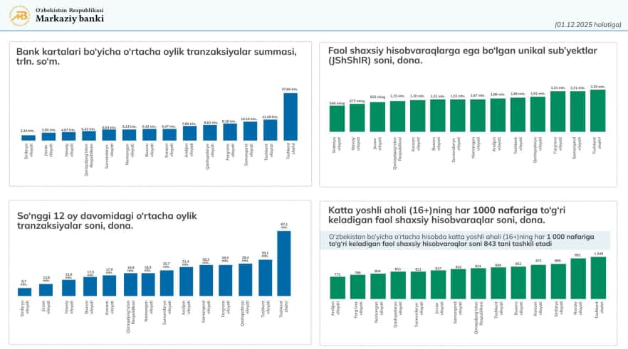 Bank kartalari orqali amalga oshiriladigan o‘rtacha oylik tranzaksiyalar qiymati bo‘yicha Toshkent shahri yetakchilik qilmoqda — 37,66 trln so‘m. Toshkent viloyatida bu ko‘rsatkich 11,4 trln so‘mni tashkil etgan. Eng past ko‘rsatkichlar Sirdaryo va Jizzax viloyatlarida qayd etilgan. Tranzaksiyalar soni bo‘yicha ham Toshkent shahri yetakchi bo‘lib, oyiga o‘rtacha 87,1 mln operatsiya amalga oshirilmoqda.