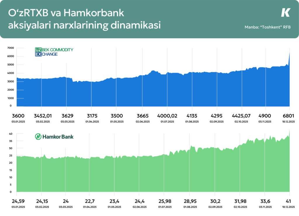 O‘zbekiston respublika tovar-xomashyo birjasi (O‘zRTXB) va Hamkorbank aksiyalari «Toshkent» fond birjasida, ayniqsa 2025-yilning ikkinchi yarmida o‘sishni namoyish etmoqda. 2025-yil 19-dekabr holatiga ko‘ra, ushbu emitentlarning oddiy aksiyalari narxi mos ravishda 7,1 ming va 40,9 so‘m darajasida qayd etildi. Taqqoslash uchun: 2025-yil 3-yanvarda qog‘ozlar mos ravishda 3,6 ming va 24,59 so‘m turardi. Kursiv Uzbekistan ekspertlardan kotirovkalar keskin o‘sishining sabablarini so‘radi.