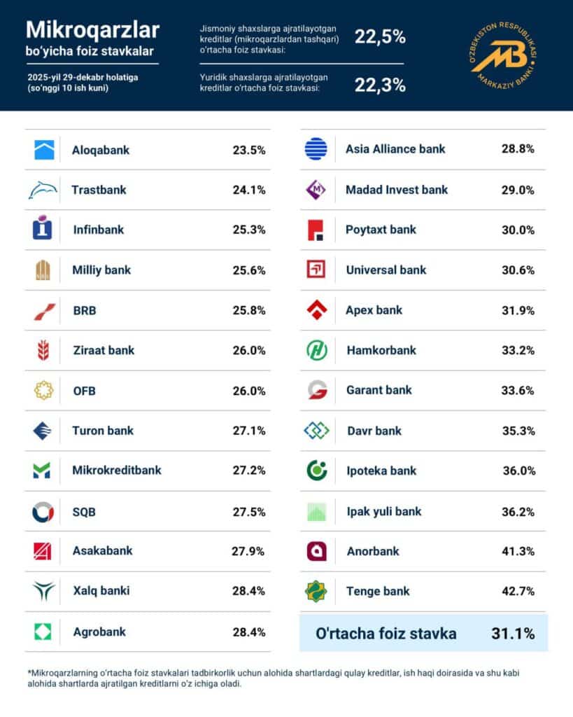 Mazkur davrda mamlakatdagi tijorat banklari tomonidan taqdim etilayotgan mikroqarzlar bo‘yicha o‘rtacha foiz stavkasi 31,1 foizni tashkil etdi. Shundan jismoniy shaxslarga ajratilayotgan kreditlarning (mikroqarzlardan tashqari) o‘rtacha foiz stavkasi 22,5 foizni, yuridik shaxslar ulushi esa 22,3 foizni ko‘rsatmoqda.