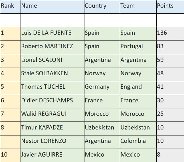 Reytingning birinchi pog‘onasini Ispaniya terma jamoasi bosh murabbiyi Luis de la Fuente band etdi. Ispaniyalik mutaxassis joriy yilda o‘z jamoasi bilan Yevropa chempionatida g‘olib chiqqan edi. Kapadze esa O‘zbekiston olimpiya terma jamoasini tarixda ilk bor Olimpiada o‘yinlariga olib chiqqani va Jahon chempionati yo‘llanmasini qo‘lga kiritgan edi.
