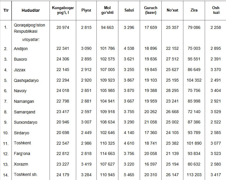 Milliy statistika qo‘mitasi palov tayyorlashda ishlatiladigan asosiy mahsulotlar narxlari asosida 1 kilogramm palovning o‘rtacha qiymatini hududlar kesimida hisoblab chiqdi. Hisob-kitobda kungaboqar yog‘i, piyoz, mol go‘shti, sabzi, guruch, no‘xat, zira va osh tuzi narxlari inobatga olingan.