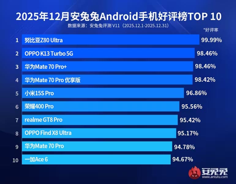 AnTuTu dekabr oyi uchun Android smartfonlar bo‘yicha foydalanuvchilarni eng ko‘p mamnun qilgan smartfonlar reytingini e’lon qildi. Reyting real foydalanuvchilarning ijobiy baholari asosida shakllantirilgan. Ketma-ket ikki oy davomida ro‘yxatga Nubia Z80 Ultra yetakchilik qilmoqda.