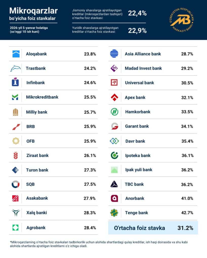 Mazkur davrda mamlakatdagi tijorat banklari tomonidan taqdim etilayotgan mikroqarzlar bo‘yicha o‘rtacha foiz stavkasi 31,2 foizni tashkil etdi. Shundan jismoniy shaxslarga ajratilayotgan kreditlarning (mikroqarzlardan tashqari) o‘rtacha foiz stavkasi 22,4 foizni, yuridik shaxslar ulushi esa 22,9 foizni ko‘rsatmoqda.